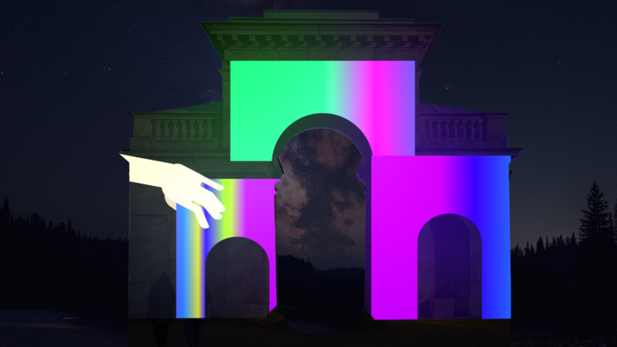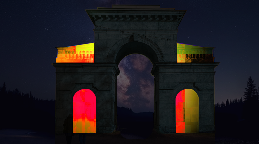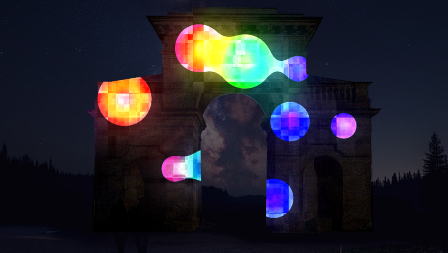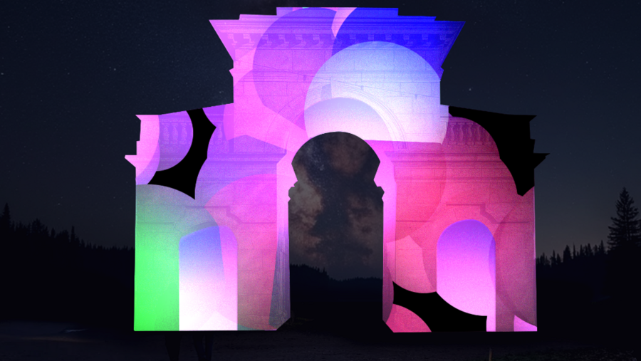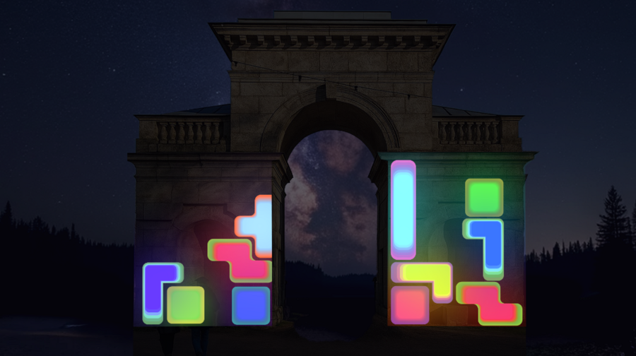 Концепция выстроена на основе схожести ворот с контруктором, построение которого я хотела передать в меппинге. Детали: яркие векторные элементы, простые формы, градиент.