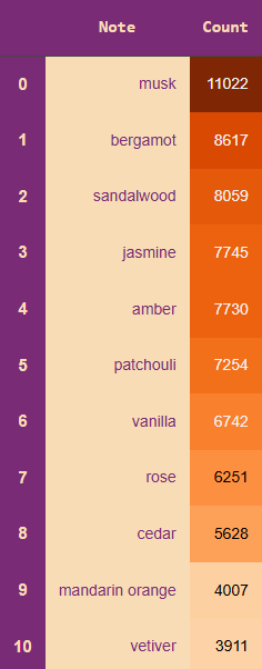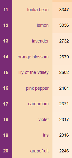 По этой таблице можно наглядно отследить количество упоминаний ингредиентов в составах самых разных ароматов. Упоминания мускуса превосходят второй по популярности бергамот почти на 2500. Ноты с меньшим количеством упоминаний отмечены в таблице бежевым цветом, так как не сильно различаются по количеству.