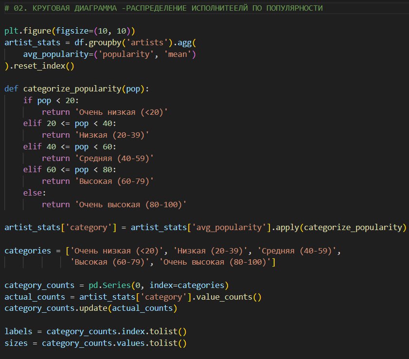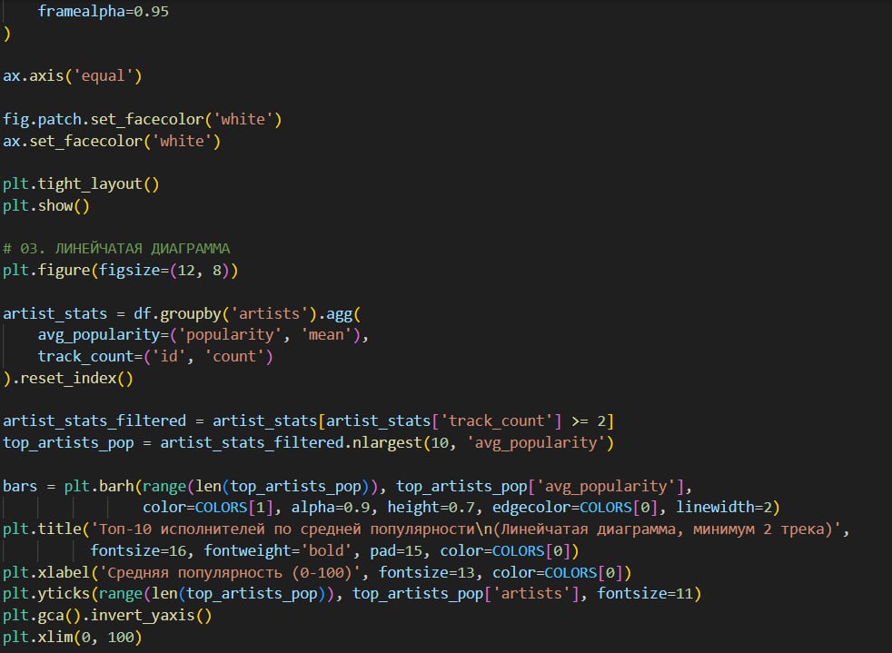 Графики дают частичное и практическое понимание интересов аудитории: большинство артистов в выборке однотрековые, поэтому средние по ним ненадёжны; реальные предпочтения слушателей сконцентрированы в середине шкалы популярности, где есть баланс узнаваемости и экспериментальности. Видна плотность популярных треков в районе 2–4 минут. Топы по средней популярности искажаются малой выборкой, а топы по числу треков не гарантируют высокую популярность