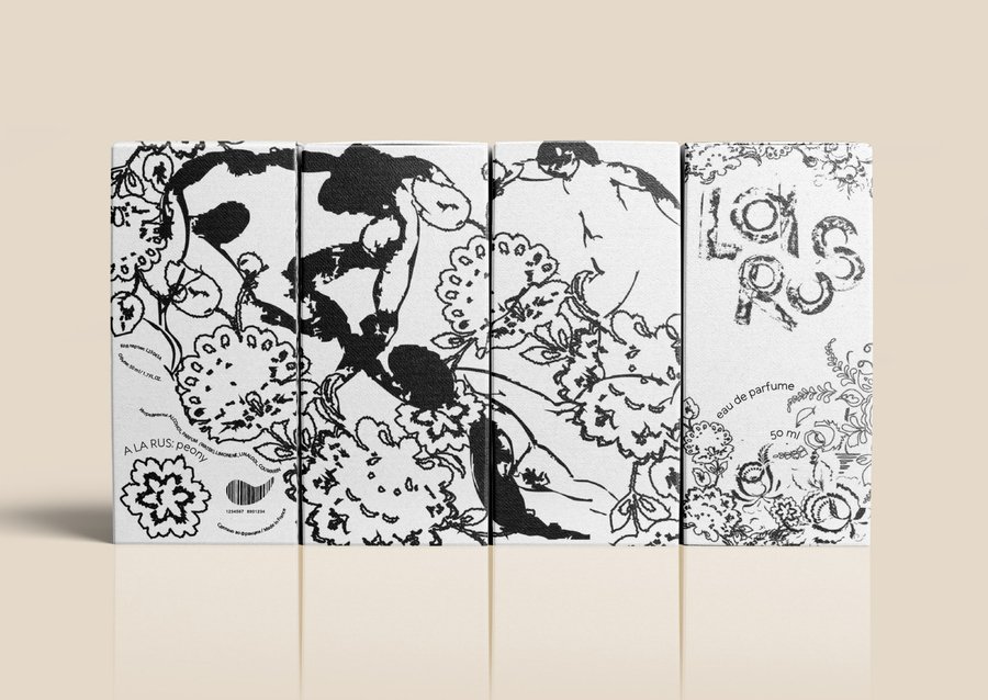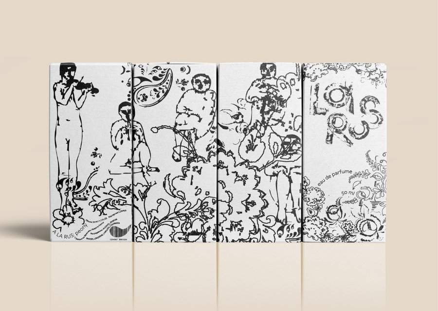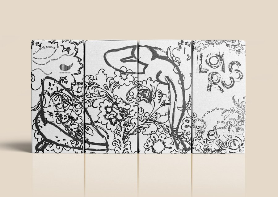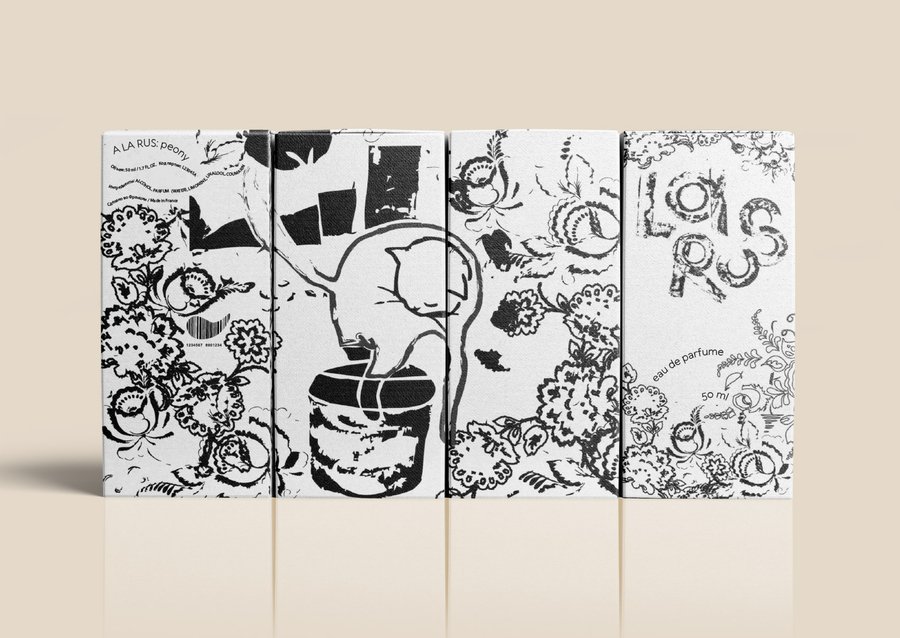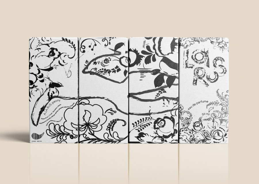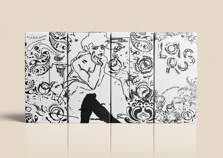 Бренд духов «A la rus» создаёт уникальные парфюмы, вдохновлённые гармонией русских и французских традиций. Дизайн упаковки для русско-французских духов представляет собой черно-белую концепцию, где творчество французских фовистов гармонично сливается с традициями русской народной росписи — гжелью и жостовской росписью.
