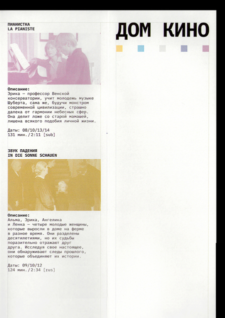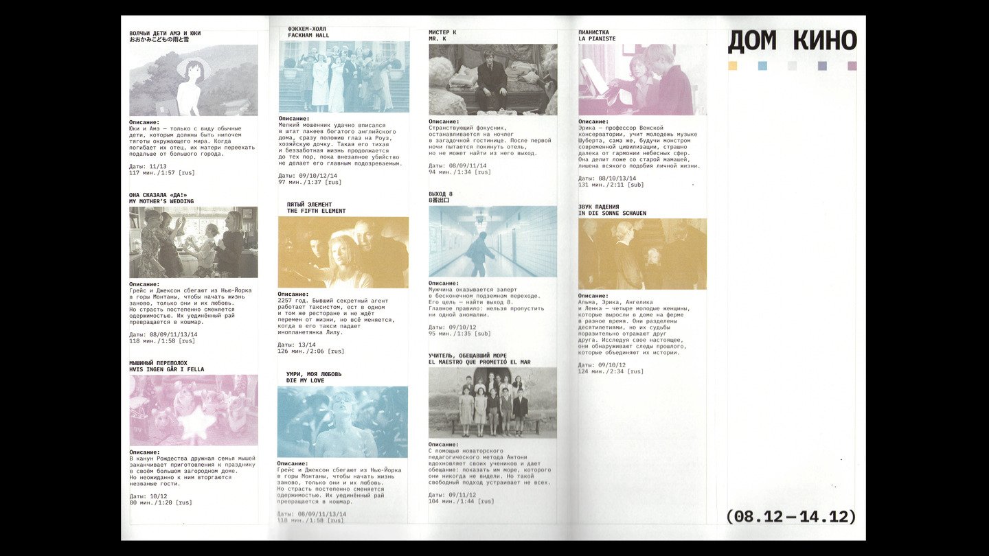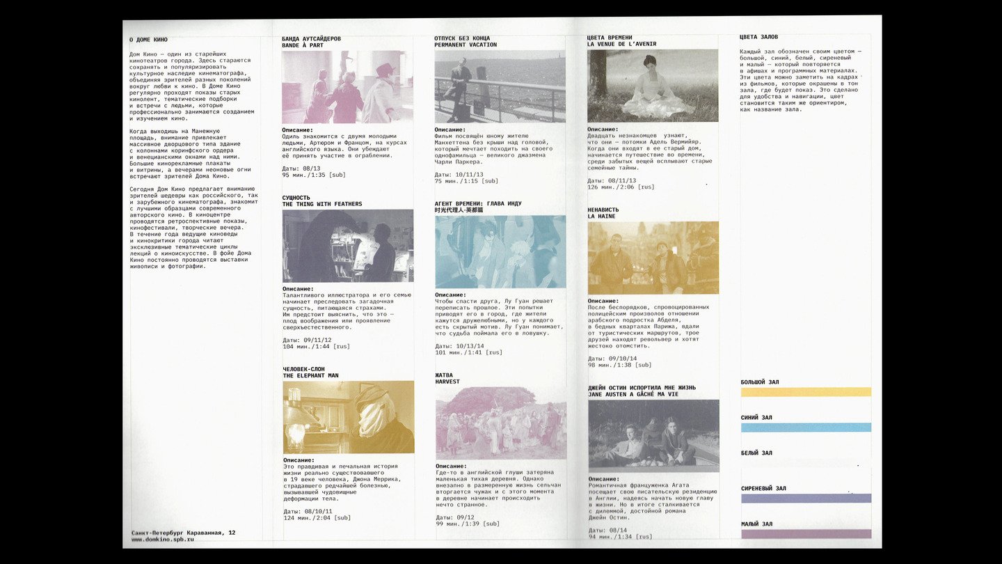 Цветовое кодирование картинок становится навигацией по залам кинотеатра. Большой зал, синий зал, белый зал, сиреневый зал и малый зал.