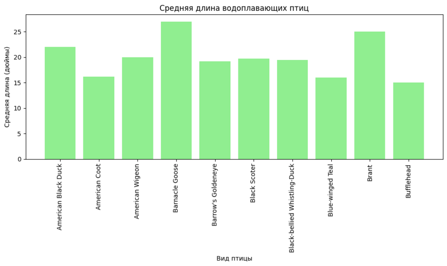 plt.figure (figsize=(10, 6)) plt.bar (df['name'], df['m_avg_length_inches'], color='lightgreen') plt.xlabel ('Вид птицы') plt.ylabel ('Средняя длина (дюймы)') plt.title ('Средняя длина водоплавающих птиц') plt.xticks (rotation=90) plt.tight_layout () plt.show ()
