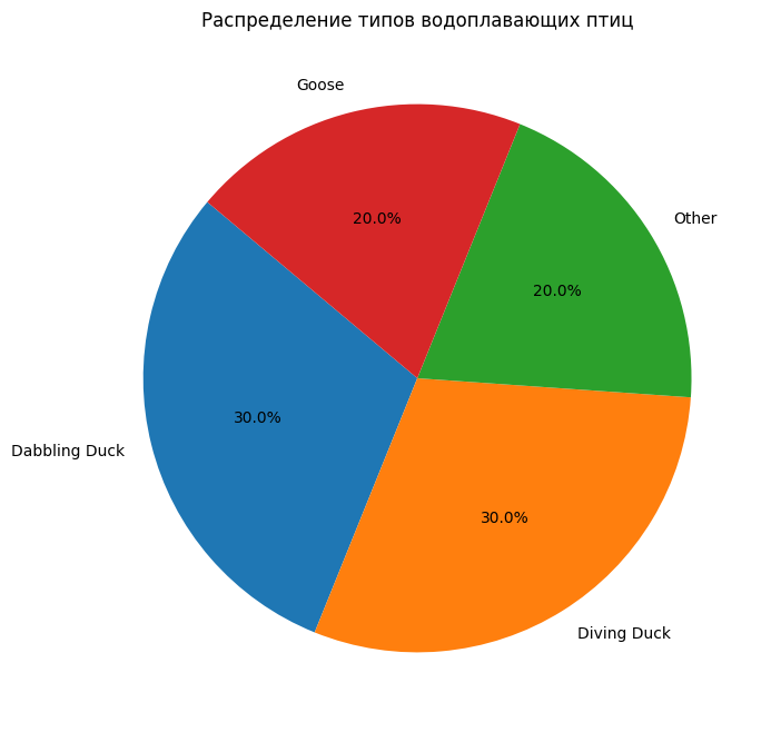 plt.figure (figsize=(8, 8)) plt.pie (type_counts, labels=type_counts.index, autopct='%1.1f%%', startangle=140) plt.title ('Распределение типов водоплавающих птиц') plt.show ()