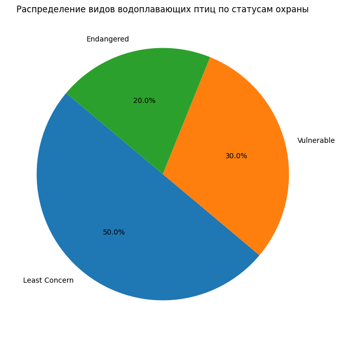 Круговая диаграмма покажет распределение видов водоплавающих птиц по статусам охраны.