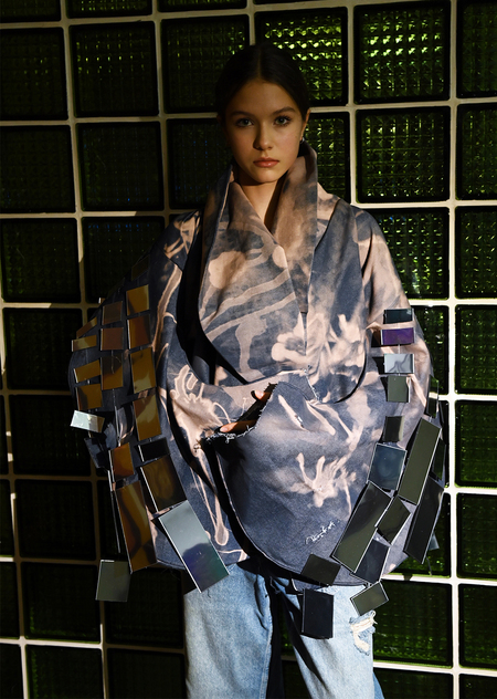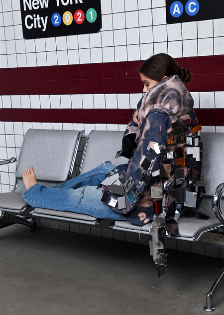 Благодаря публике зеркальные детали превращают кимоно из пассивного предмета в живой оптический объект. Кимоно сшито из джинсовой ткани — материала, который носит каждый, независимо от возраста, пола или социального статуса. Эта повседневная, универсальная ткань делает произведение демократичным: оно не отделено от жизни, а встроено в неё.