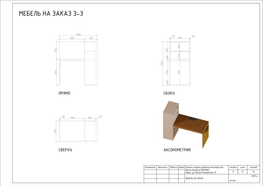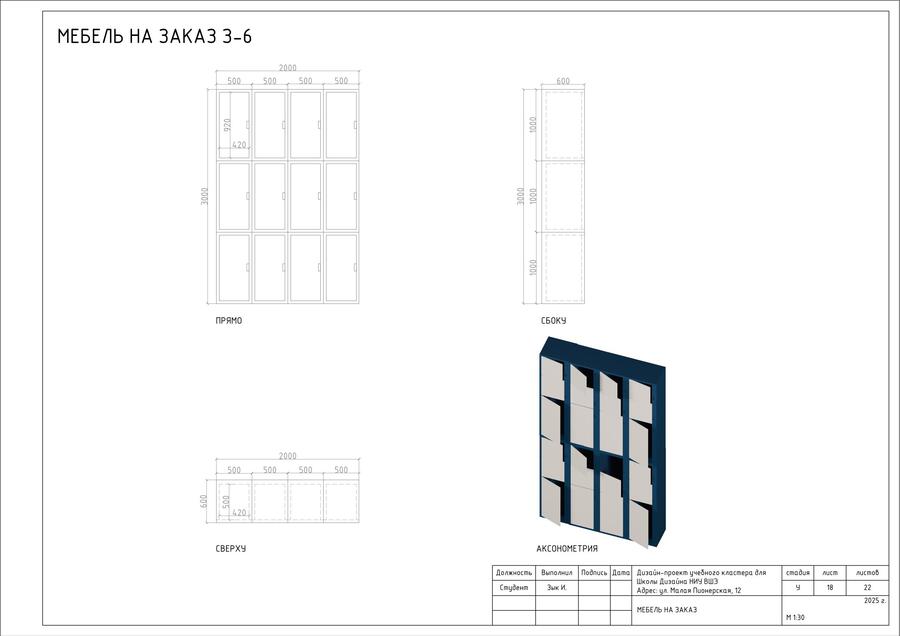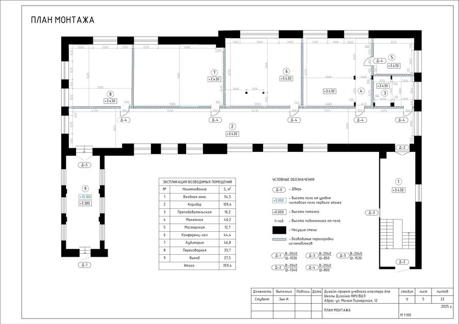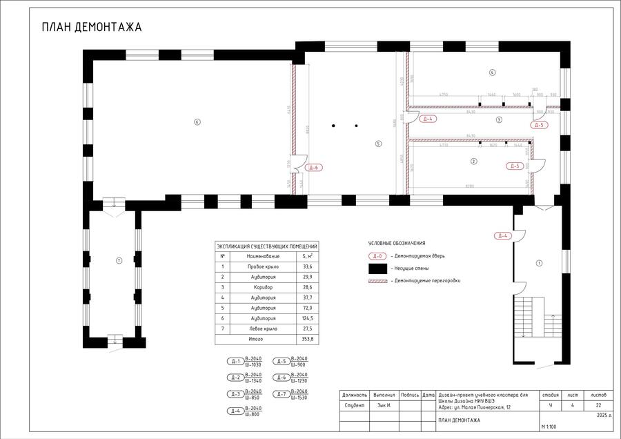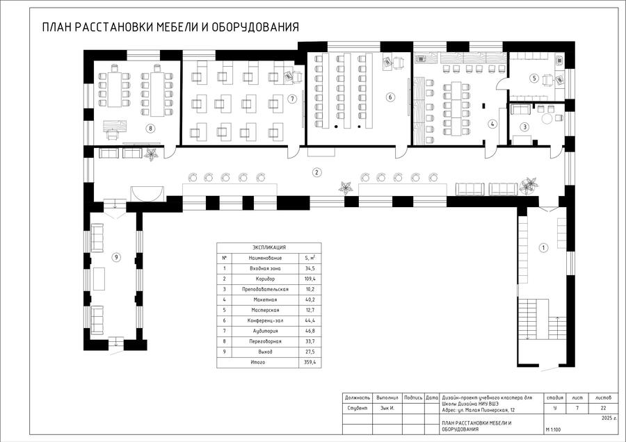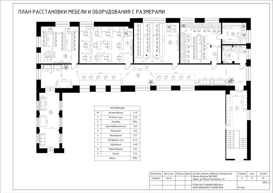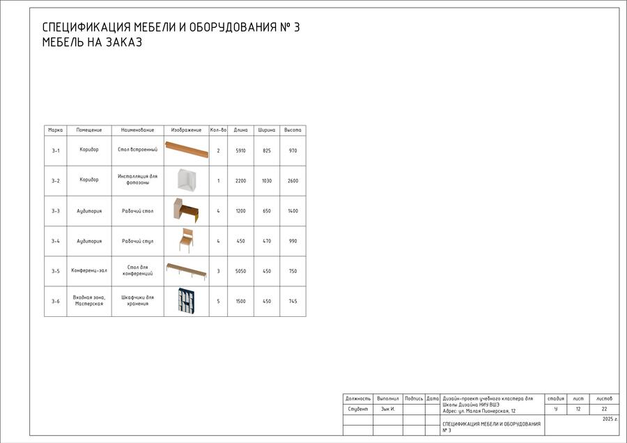 В проекте представлен альбом чертежей для дизайн-проекта учебного кластера для НИУ ВШЭ на Малой Пионерской 12. В состав проекта входят исходный чертеж, планировки, схемы демонтажа и монтажа, спецификации мебели, а также визуализации.