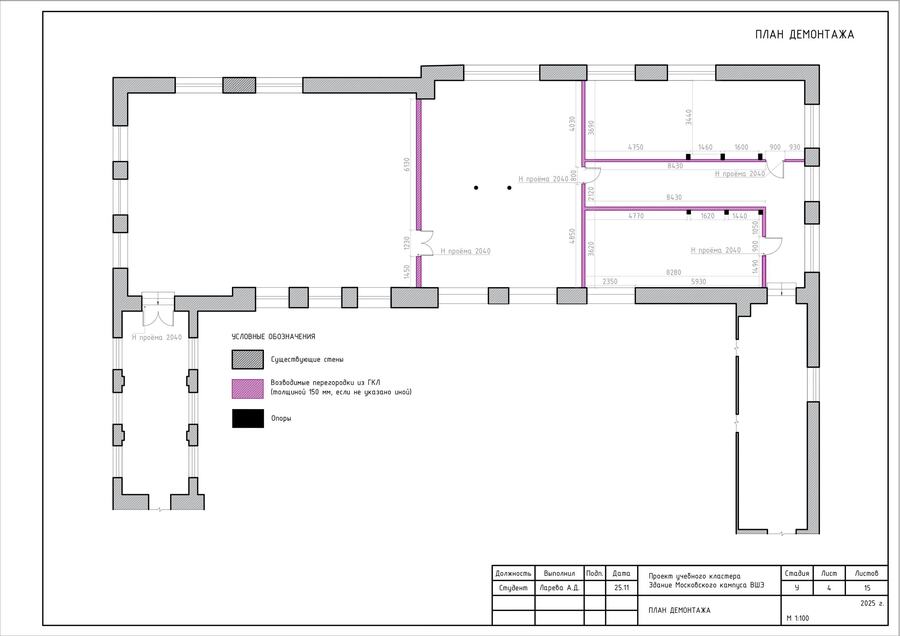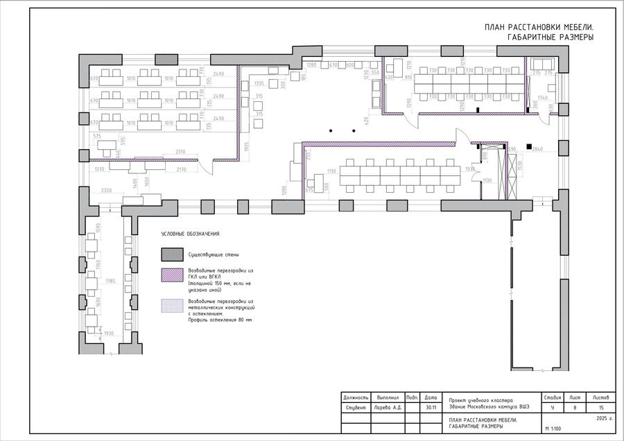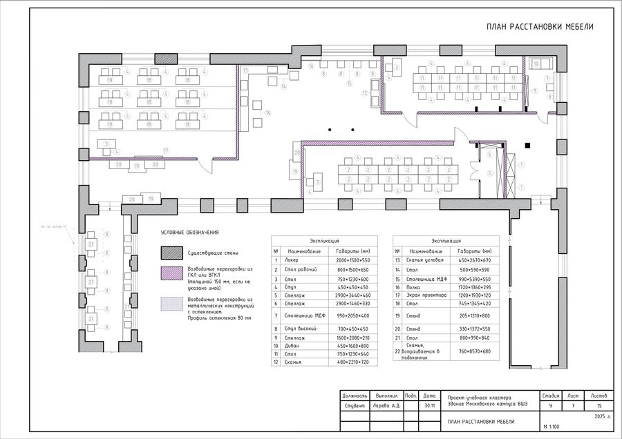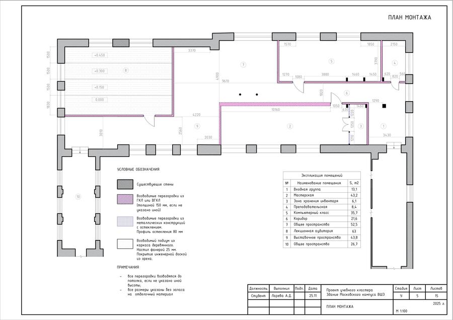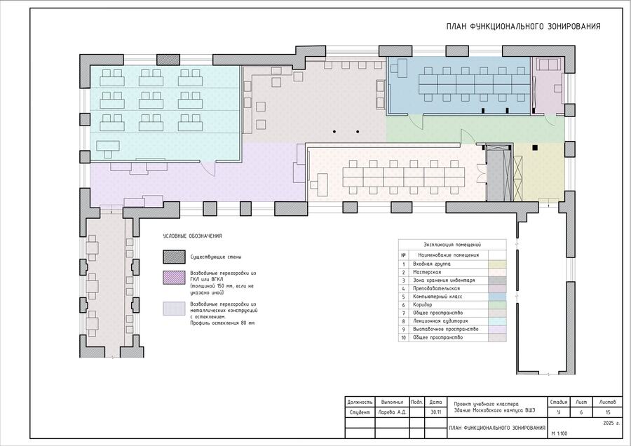 В первом модуле был разработан проект учебного кластера в здании НИУ ВШЭ в Москве (ул. Малая Пионерская, 12). Во втором же модуле, в рамках курса по освоению AutoCAD, этот проект был оформлен в виде цифрового альбома чертежей с соблюдением стандартов технической документации и методических требований. Альбом содержит планы, виды и фрагменты кластера.