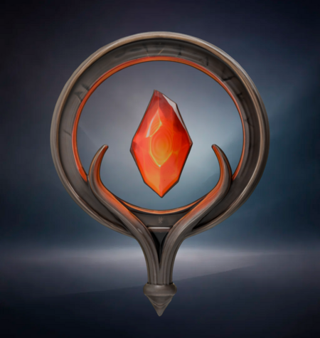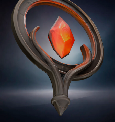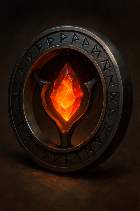 A circular arcane talisman forged from dark steel and embedded with a floating ember crystal in the center. The crystal is suspended between three curved metallic prongs
