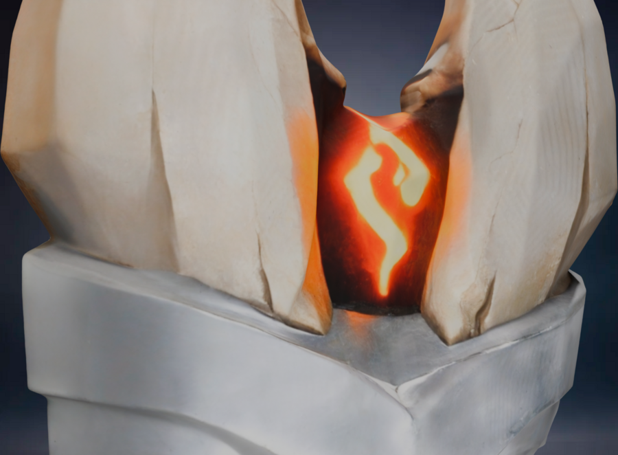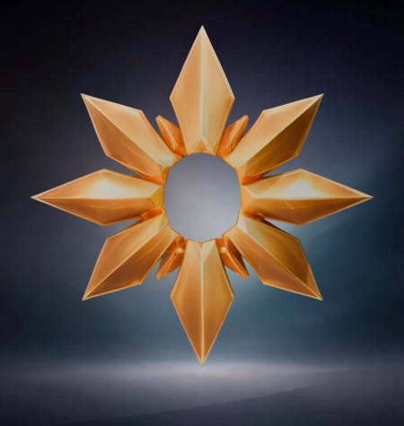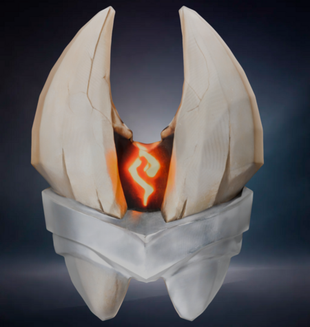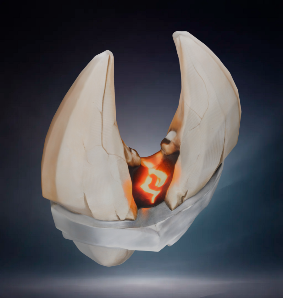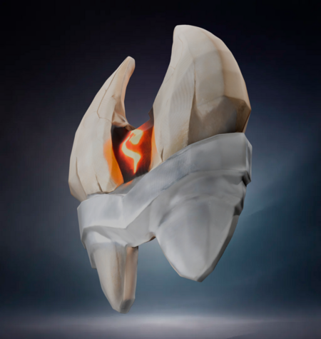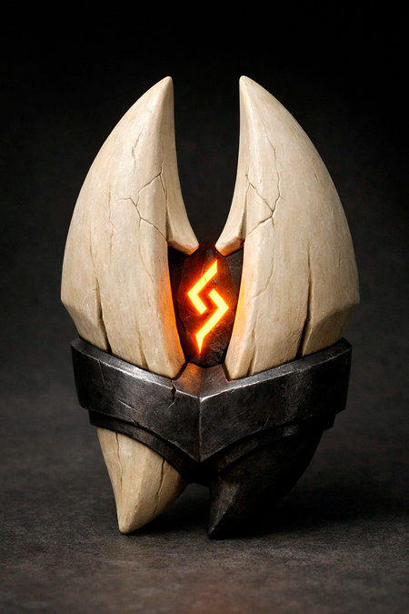 A talisman composed of several thick golden shards arranged radially around a glowing central core A talisman shaped like a massive split fang, carved from bone-like material