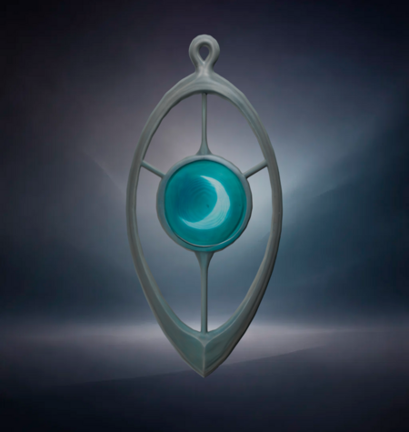 An elegant silver talisman shaped like a slightly elongated oval, holding a translucent moon-glass disc at its center. Inside the disc, a faint spectral crescent rotates slowly