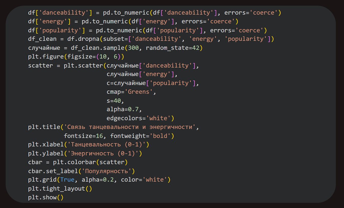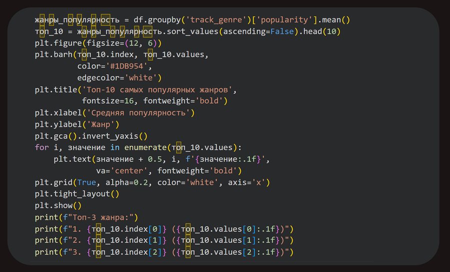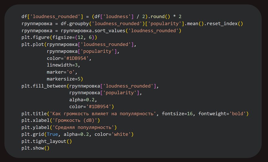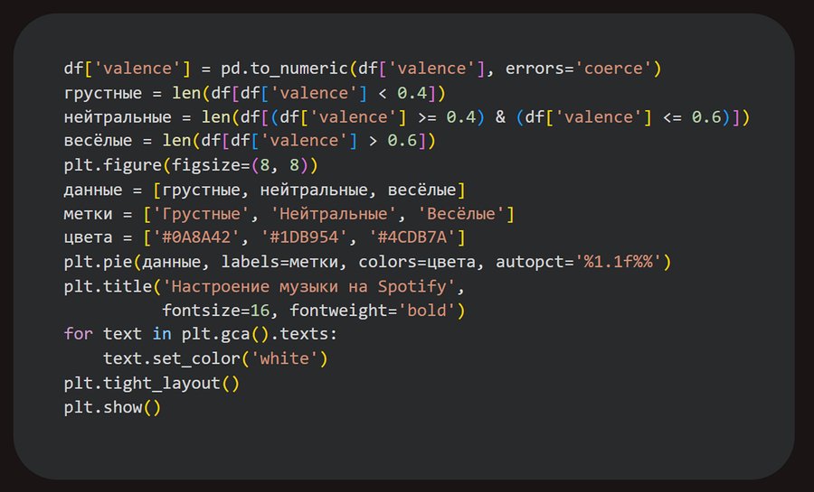 В коде я использовала библиотеки Pandas для работы с данными и Matplotlib для создания графиков. Для стилизации использовал фирменную цветовую палитру, как у Spotify: черный фон и зеленые акценты для единого визуального стиля всех графиков.