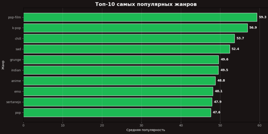 Далее я рассмотрела какие жанры лидируют в приложении. Удивительно, но самым популярным по рейтингу оказался жанр «поп-фильм» — это саундтреки и музыка из кино. Видимо, люди активно слушают музыку из фильмов и сериалов, которые им понравились. Следом идут жанры «k-pop» и «chill».