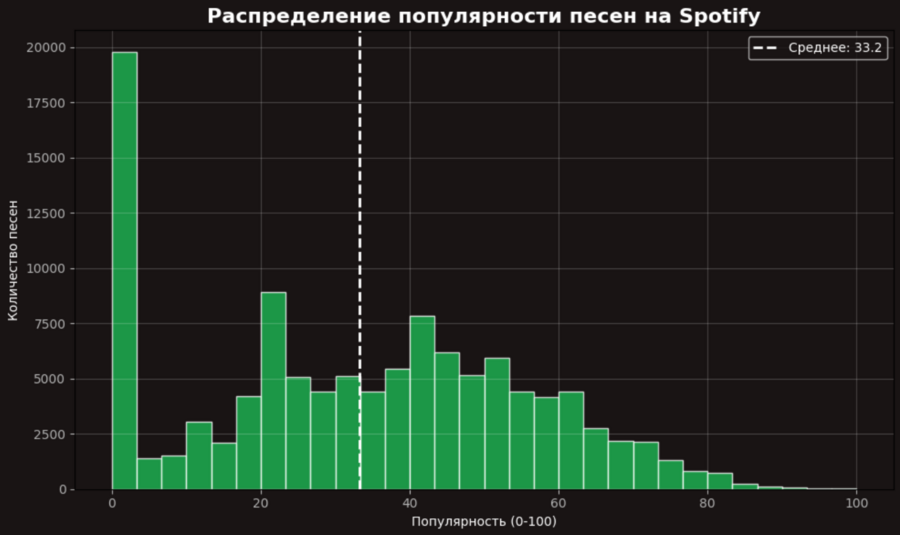 Наконец, сам Spotify дает шанс разной музыке. Большинство песен в каталоге имеют среднюю популярность, что указывает на большое разнообразие направлений и аудиторий. Алгоритмы рекомендаций помогают находить свою публику не только хитам из топ-чартов, но и менее известным трекам.