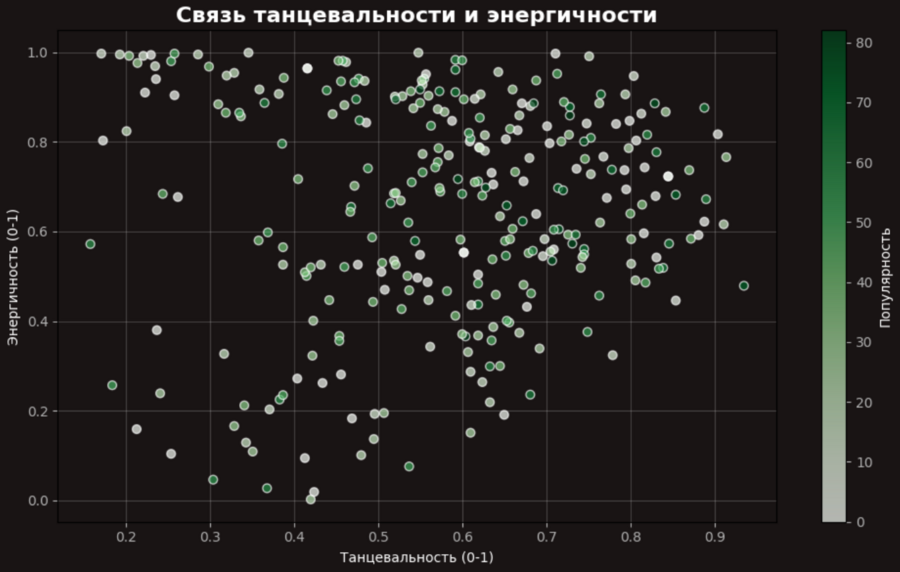 Затем я анализировала существует ли связь между популярностью треков и их энергичностью. График показал, что самые популярные (яркие точки) песни часто оказываются в одном углу — они и танцевальные, и энергичные одновременно.