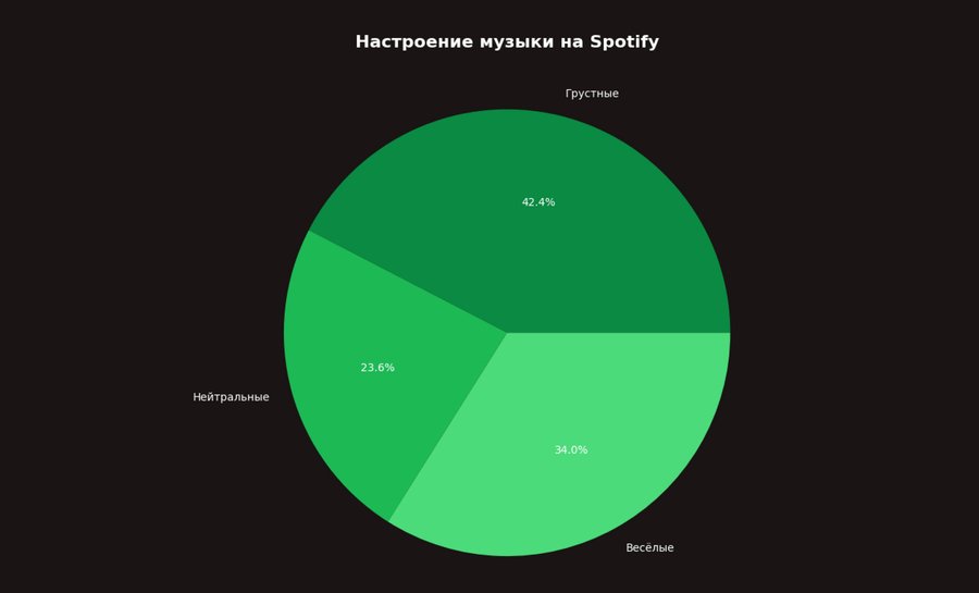 В ходе исследования я выявила еще один интересный факт. В Spotify преобладают спокойные и грустные песни вопреки популярному мнению, что подобную музыку слушают только люди, склонные к меланхоличности или в определенных ситуациях, в которых музыка бы сопутствовала настроению. Однако график доказывает, что данное мнение является ошибочным.