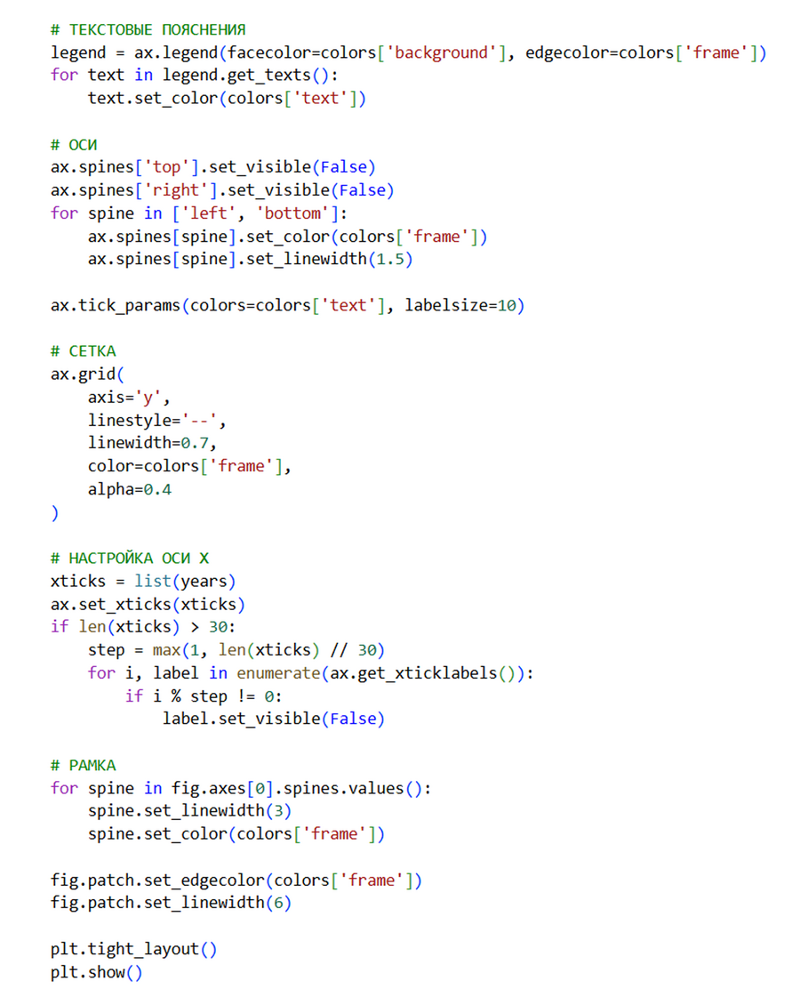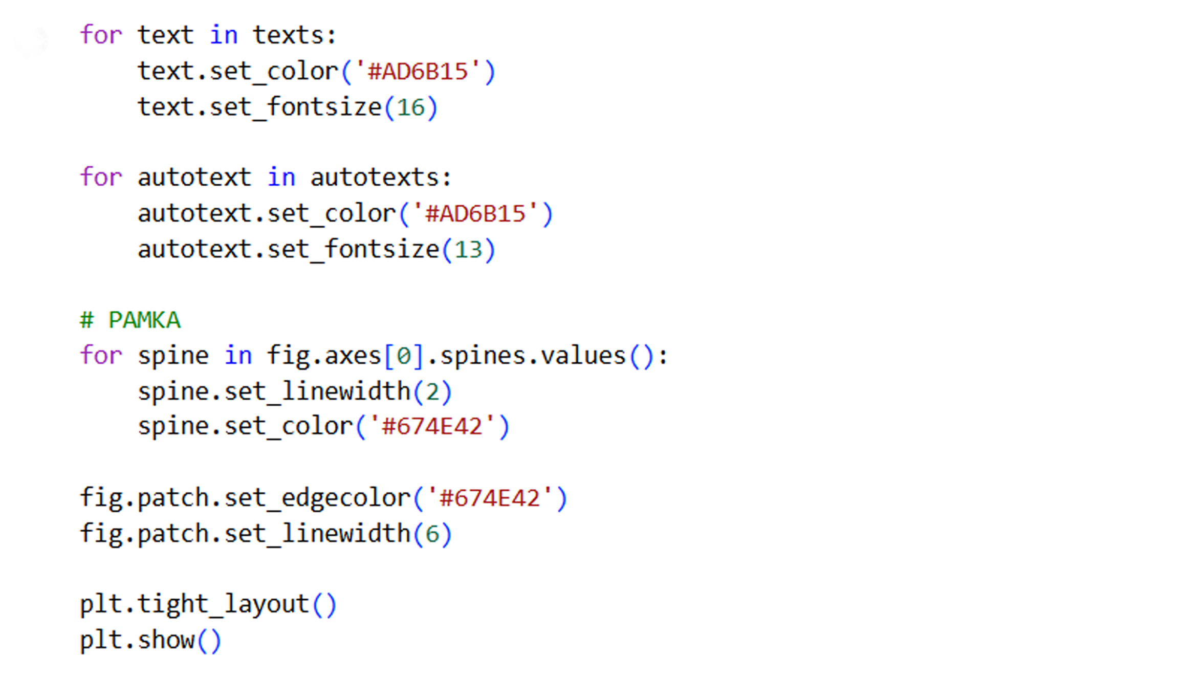Для работы с кодом я выбрала язык программирования Python, в качестве платформы — Google Colab. Перед тем как приступить к написанию кода для каждого из графиков я установила программную библиотеку Pandas, чтобы упростить свой дальнейший опыт взаимодействия с табличными данными. Кроме того, я воспользовалась Matplotlib, чтобы работать с винтажным шрифтом TwilightC вместо стандартного.