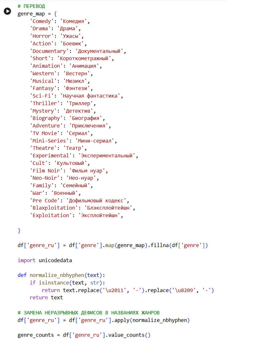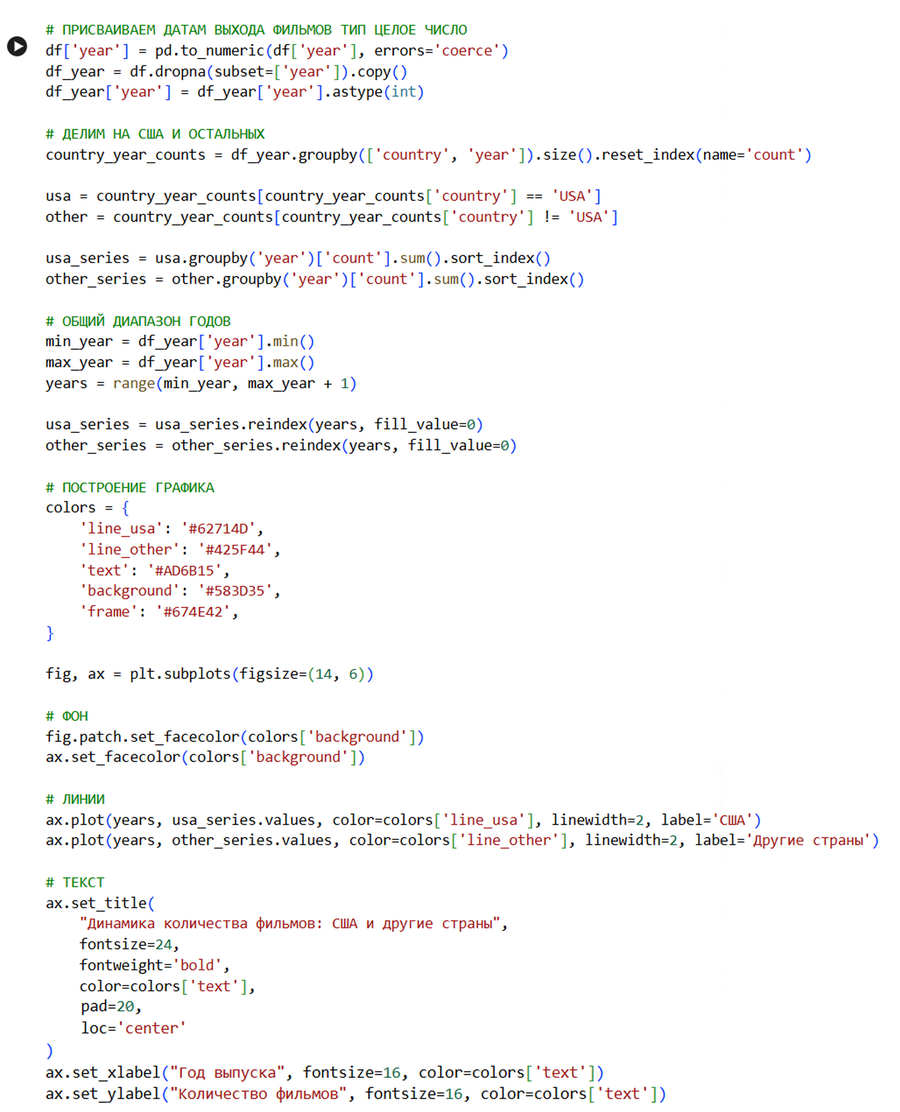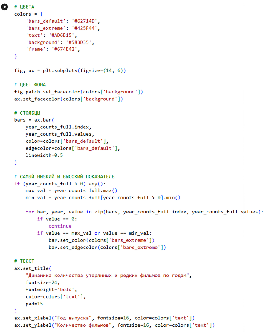Для своего проекта я выбрала данные о более чем 11000 потерянных и редких фильмах с платформы Kaggle. Мне было интересно проследить, существует ли закономерности, приводящие к утрате киноматериалов, и какой прогноз статистически можно дать на будущее. Я работала с линейными, столбчатыми и точечными графиками, круговыми диаграммами с целью проследить динамику в годах, географию производства и паттерны в названиях. Такой подход позволил мне получить наглядную интерпретацию не только общих трендов, но и микроструктур.