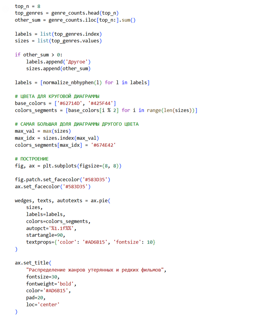 Далее я отследила фильмы каких жанров чаще всего оказывались утерянными с помощью круговой диаграммы. Это изучающий график, для которого я также применила частотный анализ. Сначала каждому названию жанра на английском языке я присвоила русскоязычный аналог и устранила все неразрывные дефисы, препятствующие корректному отображению. После подсчёта числа фильмов для каждого из жанров я выделила 8 основных самых популярных категорий, а остальные объединила в категорию «Другое», чтобы диаграмма была визуально читаемой.