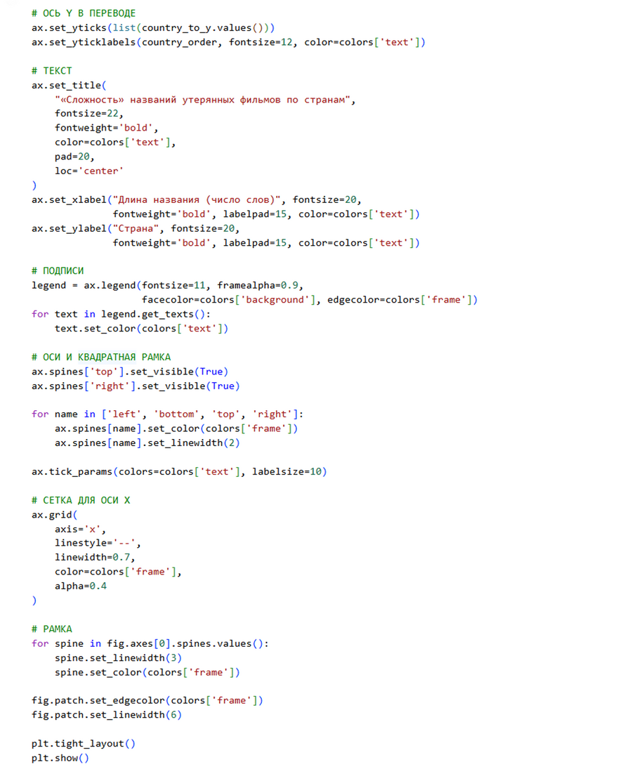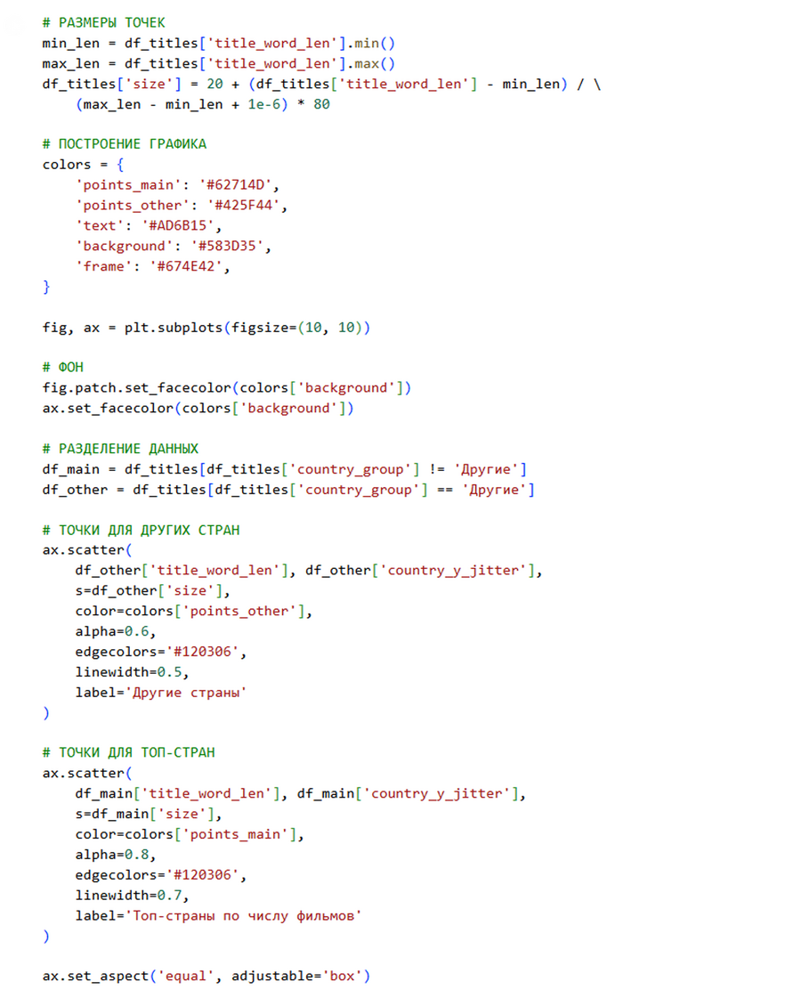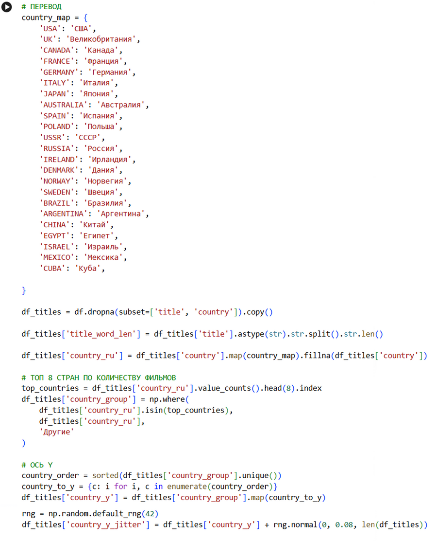 Я визуализировала объясняющий точечный график для исследования соотношения стран-производителей фильмов и длин названий, которые им дают. Этот график также помог бы ответить на вопрос, влияет ли длина названия фильма на его потенциал быть утерянным. Все названия фильмов я преобразовала в строки, а названиям стран присвоила русскоязычный перевод. Топ-страны по числу потерь я вынесла в одну категорию, другие страны сгруппировала во вторую.