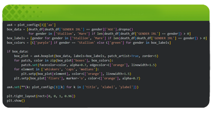 ʊ Комплексный дашборд из гистограммы, линейной диаграммы, столбчатой диаграммы и боксплота для анализа смертности, возраста и выживаемости скаковых лошадей.