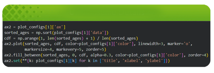 Второй график я построила, рассчитав функцию распределения. Сортировала возрасты по возрастанию, вычислила долю выживших на каждом шаге и нарисовала плавную линию с маркерами, которые отмечаются через каждые 5 точек.