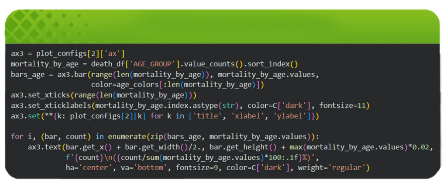 Третий график я создала, сгруппировав данные по категориям, которые подготовила ранее. Каждой группе присвоила цвет из циклической палитры. Над каждым столбцом добавила абсолютное количество смертей и процент от общего числа. Подписи по оси X повернула.