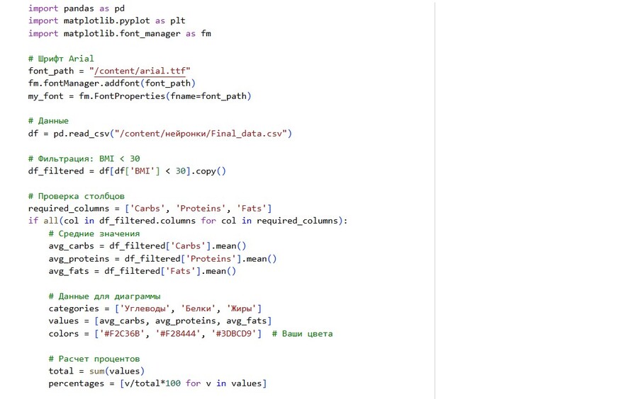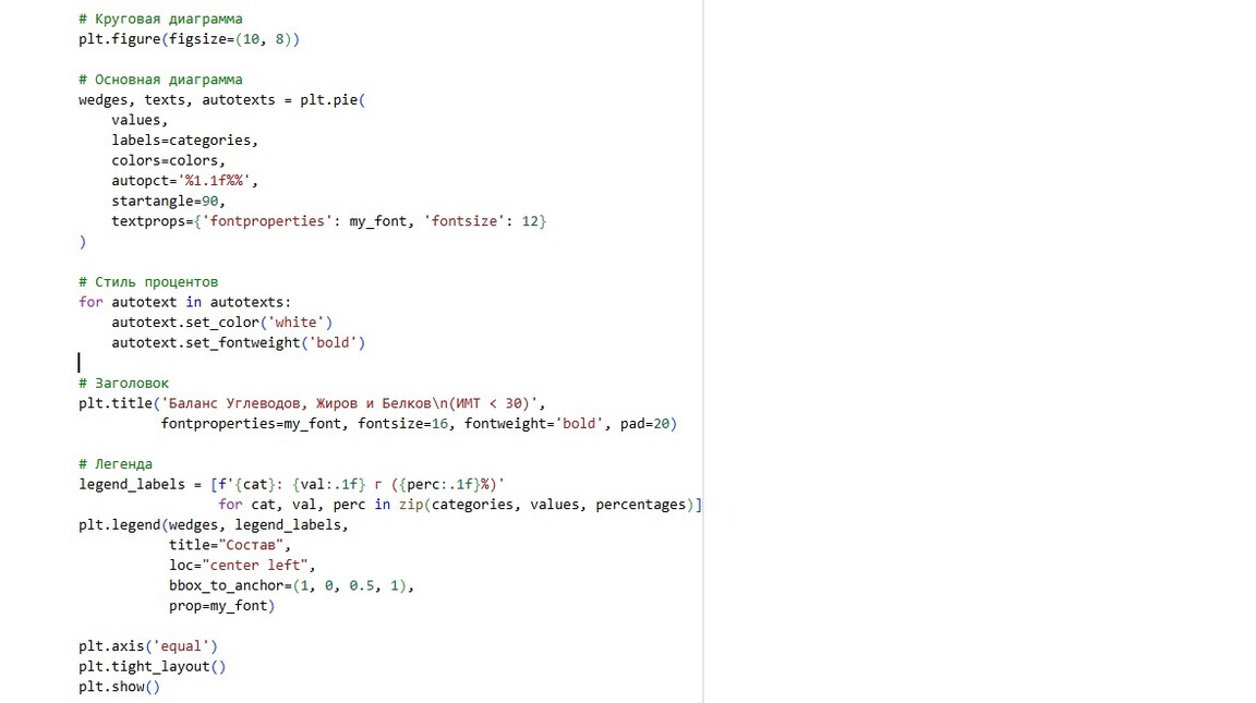 Диаграмма показывает долевое распределение трёх ключевых макронутриентов в усреднённом рационе людей с индексом массы тела (ИМТ) менее 30, что считается максимальной нормой. Лидирующую позицию, согласно построенной визуализации, занимают углеводы, выступая основным источником энергии для организма. Белки, являющиеся главным строительным материалом для тканей, занимают вторую по величине долю. Жиры, необходимые для гормонального синтеза и усвоения витаминов, завершают эту структуру, составляя наименьшую, но критически важную часть баланса.