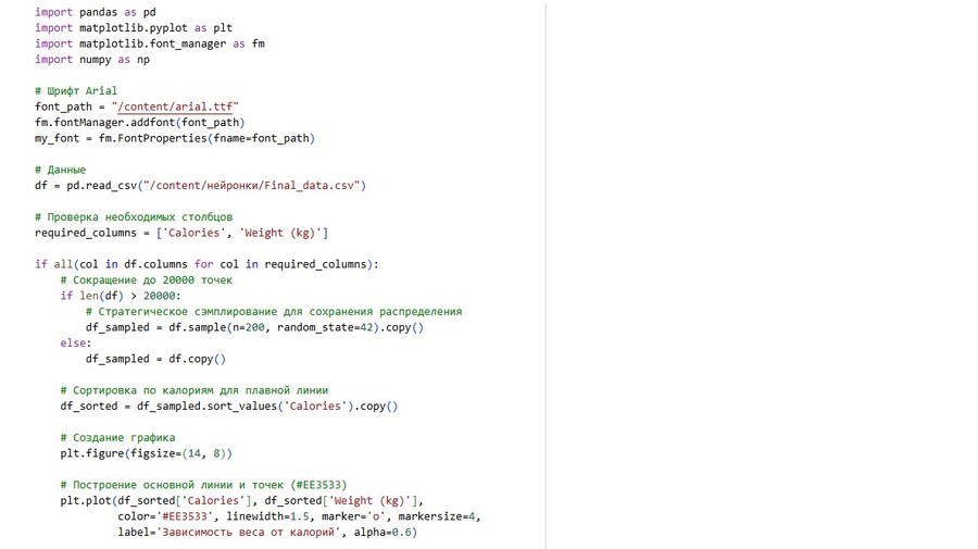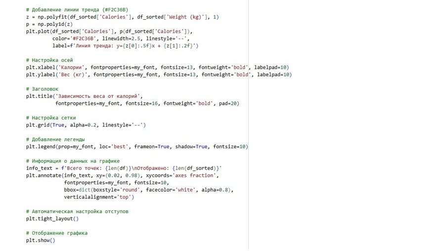 Так, график подтверждает связь между весом и калорийностью рациона, однако помимо этого есть и другие факторы, влияющие на изменения.