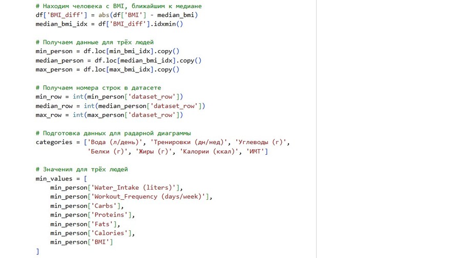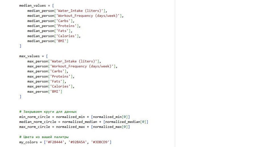 Здесь представлено 3 профиля 7 ключевых, на мой взгляд, показателей здоровья и активности. Профиль человека с максимальным ИМТ чаще всего занимает наиболее удаленное от центра положение по осям в том числе и в тренировках. Профиль человека с минимальным ИМТ меньше всего потребляет калорий и воды. Профиль с медианным ИМТ чаще всего занимает промежуточное положение, отражая усреднённые характеристики выборки. Однако линии профилей пересекаются, что указывает на отсутствие строгой зависимости между ИМТ и отдельными показателями. Кроме того, отметим и тот факт, что это данные по конкретным людям из датасета, которые все имеют определенный образ жизни. Заметим, что баланс белков, жиров и углеводов практически идентичен, то есть по этому показателю можно судить, что люди из таблицы соблюдают некоторые нормы потребления, также они все тренируются. Таким образом, каждый профиль отображает показатели человека, который уже находится на пути здорового образа жизни, но находится в разных положениях.