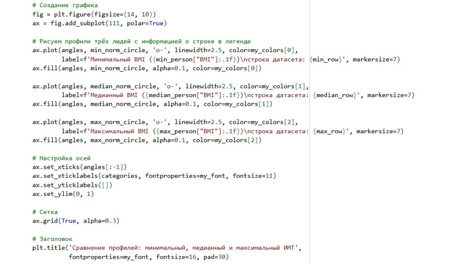 Последняя диаграмма, которую мы рассмотрим, отображает несколько профилей выбранных людей с минимальный, медианный и максимальный ИМТ. Я использовала дескриптивный статистический метод, где визуализируется масса данных. При это все показатели были нормализированы, так как изначально они имели разные единицы измерения и диапазоны значений, что могло помешать корректно отобразить график.