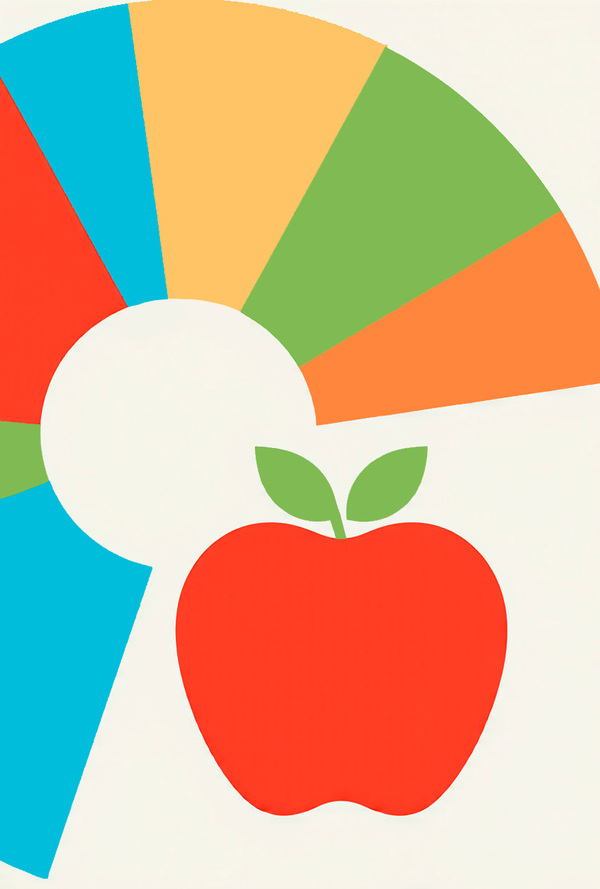 Промпт // Pure visual cover, no text or numbers, clean white background, 3500×2480. Minimalist composition: a single apple placed exactly in the center, designed as a color-segmented balance wheel integrated into the apple shape. Use only these hex colors for the segments: 3DC9D9 99BF60 F2B66D F27649 F23535. Sophisticated, minimalist, vector-like shapes, crisp edges, subtle soft shadow for gentle depth, lots of white space — visually communicates nutritional balance. No typographic elements of any kind, no additional symbols or icons. Maintain exact colors. --ar 141:100 --style raw --v 6.0