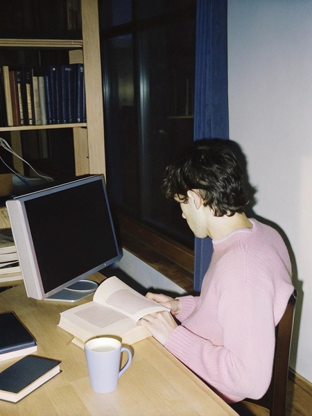 Промт для генерации изображения в Recraft: A realistic photo of a student studying at a computer in their room. A young man, 18–22 years old, is sitting at a desk, focused on the laptop screen. On the desk are notebooks, textbooks, pens, and a coffee mug. The room is small, cozy, with a neutral interior: light-colored walls, a bookshelf, and posters or notes on the wall. Natural daylight comes from a window on the side, casting soft shadows. Casual clothing: hoodie or t-shirt. Photorealistic, highly detailed, natural colors, depth-of-field effect, shot on a DSLR, 35 mm, f/1.8, cinematic lighting, ultra-realistic, no posing, candid shot.