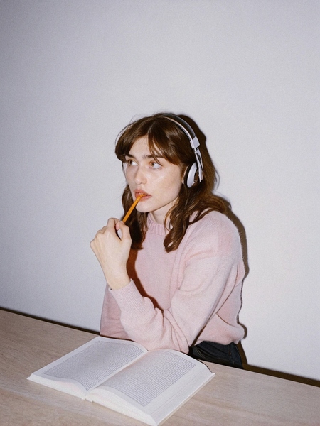 Справа: A realistic photo of a young woman wearing headphones, sitting in front of a book, thoughtfully biting a pencil. She is wearing a pink sweater. Natural lighting, soft shadows, photorealistic, highly detailed, candid shot, depth of field, DSLR quality, 35 mm lens, f/1.8, cinematic lighting, ultra-realistic, no posing