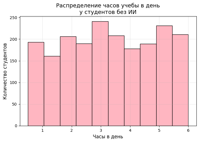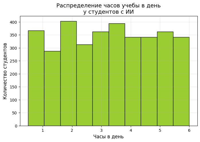 Гистограммы показывают распределение часов учебы в день среди студентов которые используют ИИ и тех, кто не использует ИИ Можно сравнить, сколько времени в среднем тратят на учебу разные группы студентов.