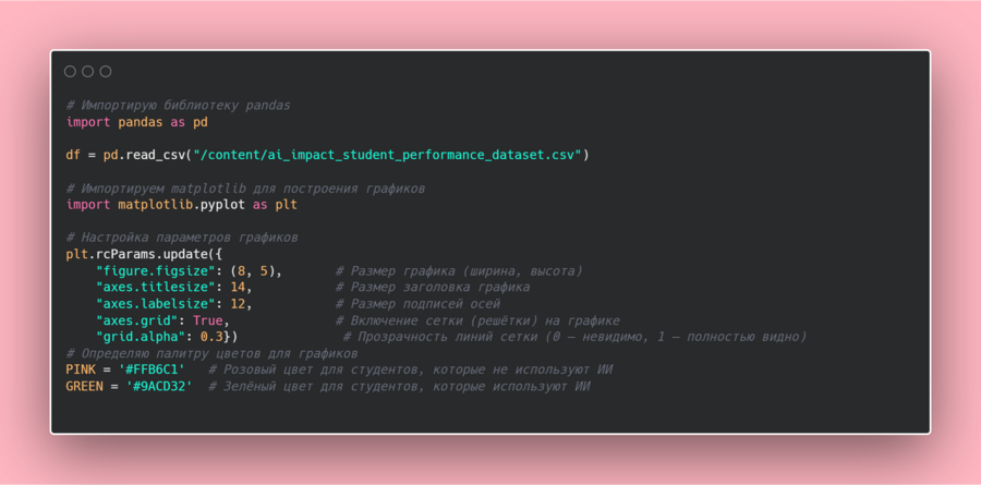 Цель анализа — исследовать взаимосвязь между использованием ИИ и ключевыми показателями успеваемости. Для этого я использую набор данных, в котором содержится информация о студентах, их привычках в обучении, использовании ИИ и результатах учебы.