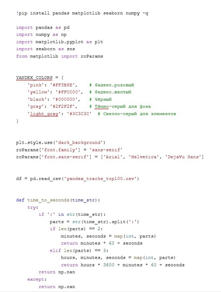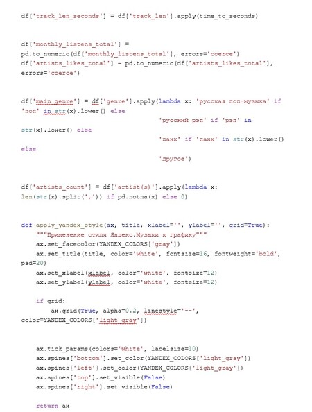 Целью данного исследования является анализ характеристик популярных музыкальных треков из топ-100 сервиса Яндекс Музыка с использованием методов анализа данных и визуализации. В рамках проекта исследуется распределение популярности треков, жанровая структура, а также вклад отдельных исполнителей в формирование музыкального чарта. Дополнительной целью является выявление общих закономерностей в данных и наглядная демонстрация того, как с помощью библиотеки Pandas можно изучать и интерпретировать культурные и медиаданные.