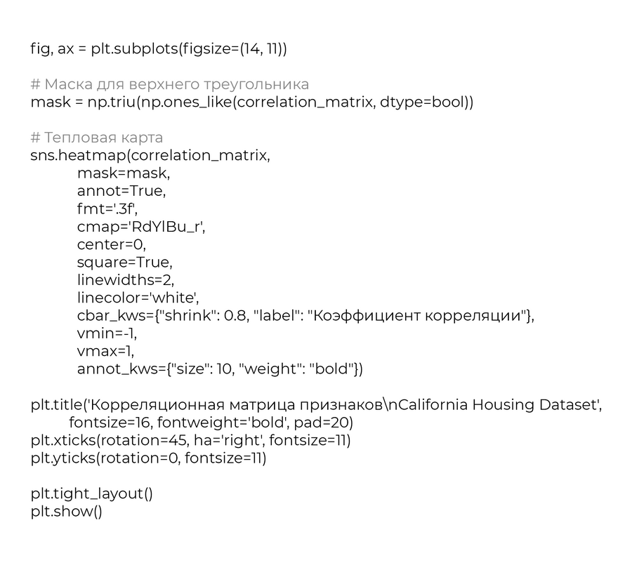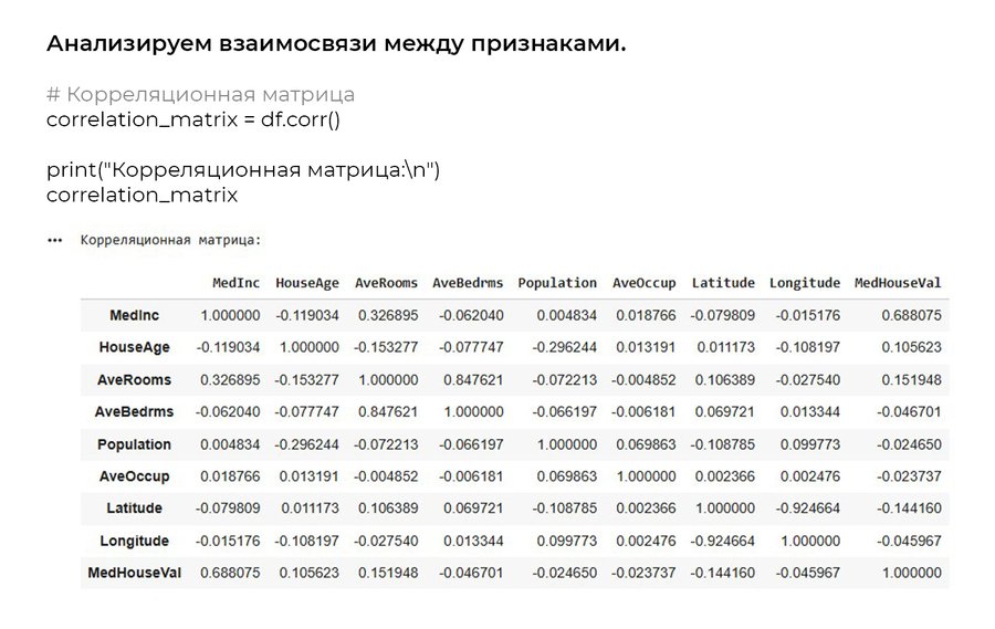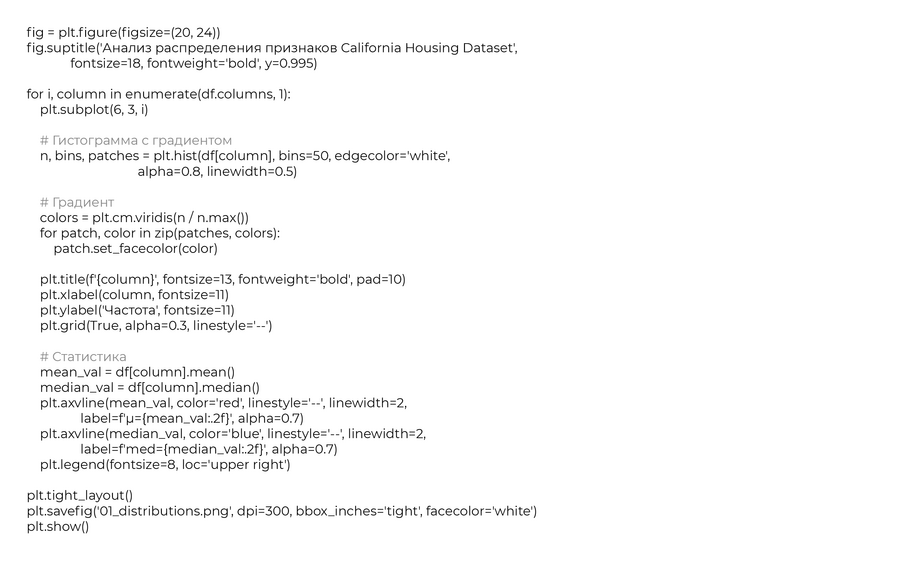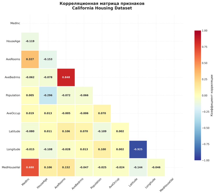 MedInc — Медианный доход в районе — ×$10,000 HouseAge — Медианный возраст домов — годы AveRooms — Среднее количество комнат на дом — комнаты AveBedrms — Среднее количество спален на дом — спальни Population — Население района — человек AveOccup — Среднее количество жильцов на дом — человек Latitude — Широта — градусы Longitude — Долгота — градусы MedHouseVal — Медианная стоимость жилья (целевая) — ×$100,000