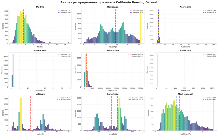 Стоимость жилья (MedHouseVal): Среднее: ~ 207,000. Медиана: 180,000 Максимум: $500,000 (искусственное ограничение)
