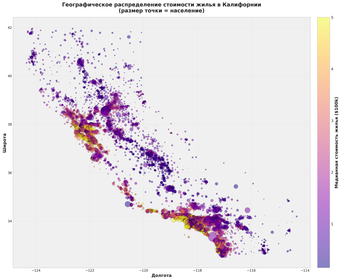 Рынок жилья Калифорнии характеризуется сильной зависимостью от экономического благосостояния населения и выраженным географическим неравенством. В то время как доход является основным драйвером цен, географические и демографические особенности штата создают сложную систему, требующих точечного, локализованного подхода к анализу и прогнозированию.