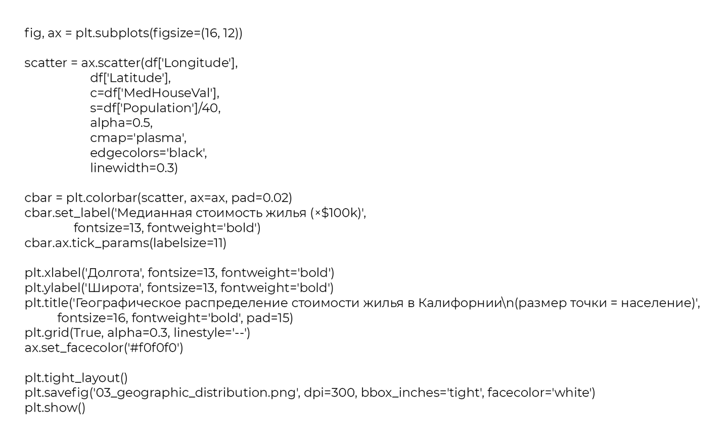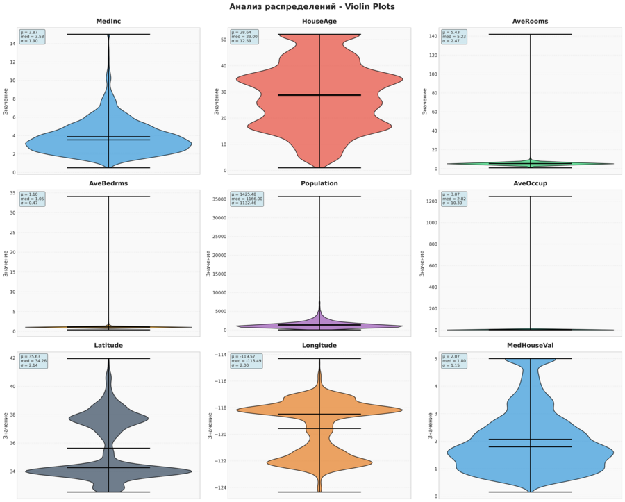 Такой набор визуализаций позволяет получить полное представление о данных: от общих статистических характеристик до сложных пространственных закономерностей и взаимосвязей между переменными. Каждый тип графика выбран для решения конкретных аналитических задач и в совокупности они создают целостную картину факторов, влияющих на стоимость жилья в Калифорнии.