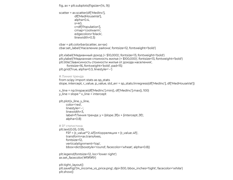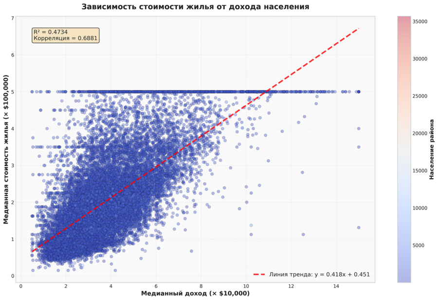 Основные детерминанты стоимости жилья Доход населения является наиболее значимым фактором, определяющим стоимость жилья в Калифорнии (коэффициент корреляции +0.688). Эта сильная положительная взаимосвязь подтверждает базовый экономический принцип: покупательная способность населения напрямую влияет на ценовой уровень недвижимости. Линейная регрессия показывает, что увеличение медианного дохода на $10,000 ведет к росту стоимости жилья примерно на $42,000.