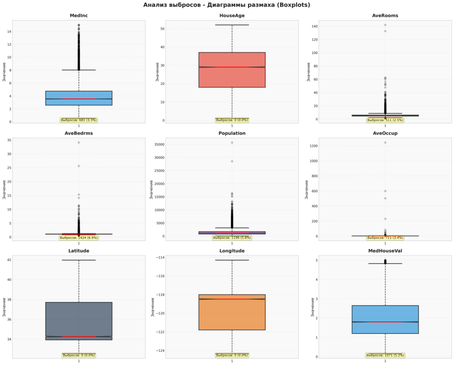 AveBedrms — больше всего выбросов (6.9%) Population — много районов с экстремальным населением Latitude, Longitude — нет выбросов (географические координаты)
