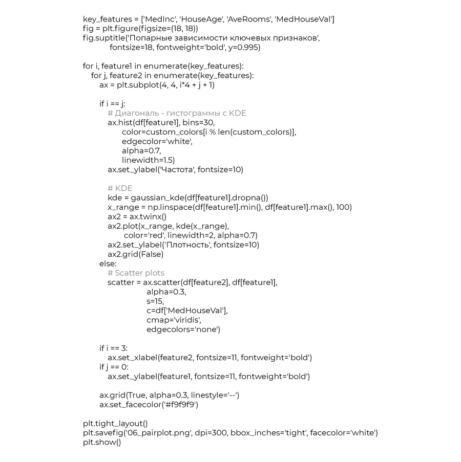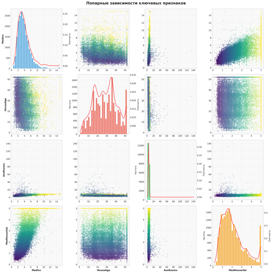 MedInc × MedHouseVal: четкая положительная связь HouseAge × MedHouseVal: слабая связь (разброс) Диагональ: распределения + плотность (KDE)