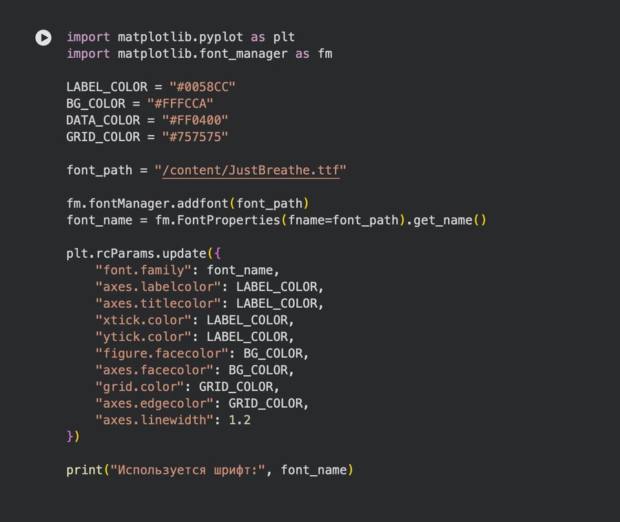 Скачиваем и регистрируем шрифт. В дополнение к шрифту задаём фирменные цвета для графиков