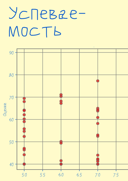 В качестве фонового цвета я выбрала кремовое-жёлтый, как цвет страниц в старой тетради. Синий цвет для подписей ассоциируется с надписями в тетради, серый отсылает на графики, построенные простым карандашом. Красный цвет выбран в качестве акцентного, как будто учитель исправляет в тетради ошибки на верные ответы. Шрифт Just Breathe имитирует быстрый и неаккуратный почерк студента