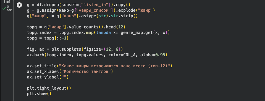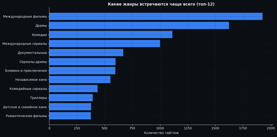 Диаграмма с топ-жанрами показывает, какой контент доминирует в каталоге Netflix. Лидируют драмы, комедии и международные проекты, что подчёркивает ориентацию платформы на широкую и глобальную аудиторию.