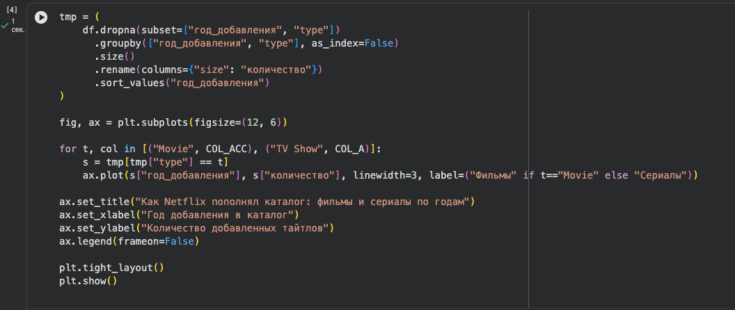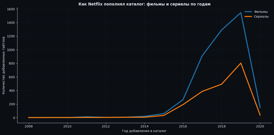 Линейный график показывает, как Netflix пополнял каталог по годам, отдельно для фильмов и сериалов. Видно, что со временем темпы добавления контента растут неравномерно, с выраженными периодами ускорения.