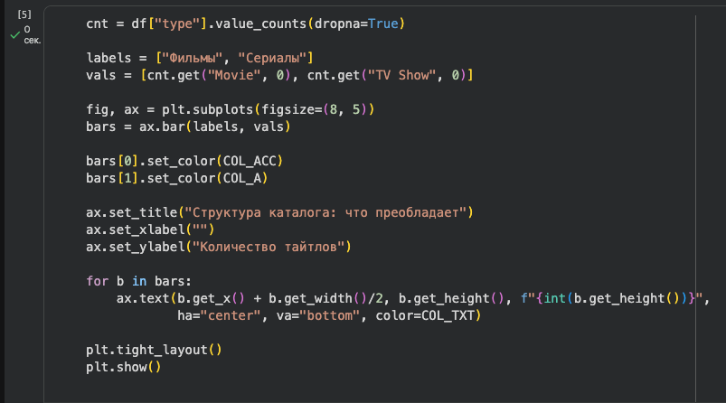 Столбчатая диаграмма демонстрирует соотношение фильмов и сериалов в общем объёме каталога. Несмотря на рост сериалов, фильмы по-прежнему занимают значительную долю, что говорит о сохранении баланса между классическим кино и сериалами.