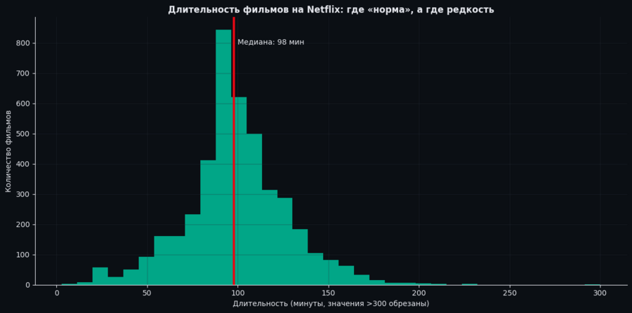Гистограмма отражает распределение длительности фильмов на Netflix. Большинство фильмов укладывается в ограниченный диапазон значений, формируя представление о «типичном» формате стримингового фильма.