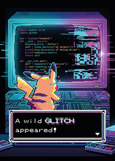 > «Vertical poster, Pixel art style Pokemon battle, glitch effect, Pikachu standing in front of a giant computer screen with python code, dark mode, neon cyan and magenta lighting, retro gaming console atmosphere, detailed pixels, black background»
